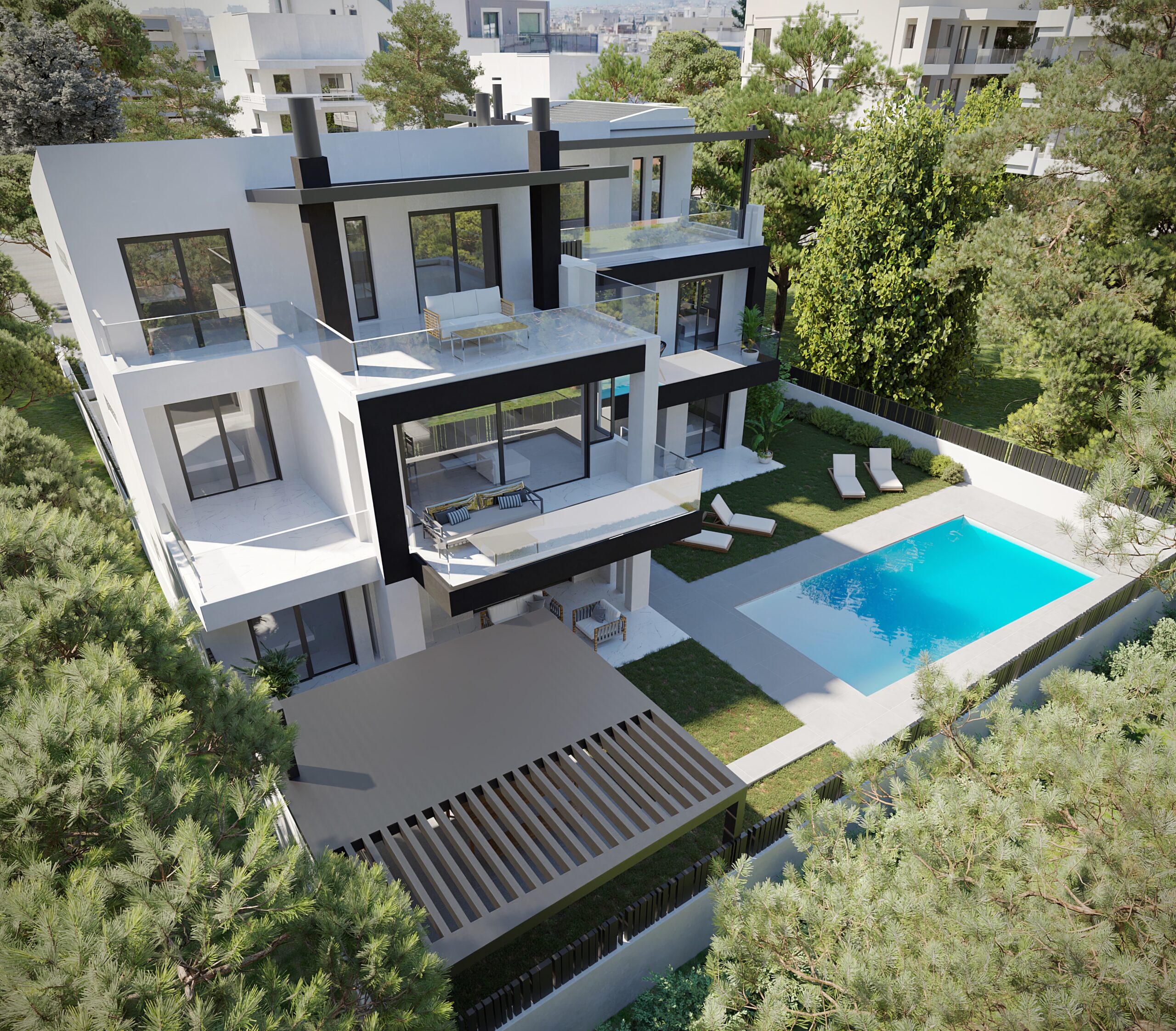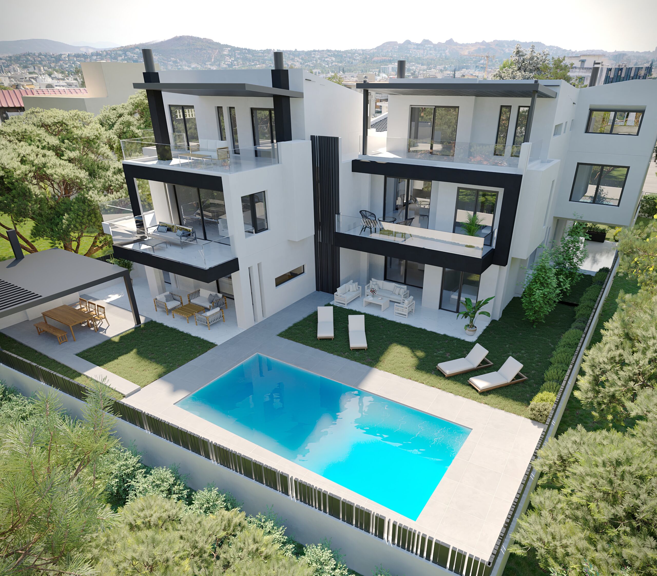 Κάθε διαμέρισμα διαθέτει μεγάλες βεράντες με ανεμπόδιστη θέα, αποθήκη και ιδιωτική θέση στάθμευσης. Οι εσωτερικοί χώροι είναι διαμορφωμένοι με μοντέρνα αισθητική, κουζίνες υψηλής αισθητικής και σύγχρονα συστήματα θέρμανσης-ψύξης με αντλίες θερμότητας. Η εξωτερική θερμομόνωση και τα ενεργειακά κουφώματα εξασφαλίζουν χαμηλή κατανάλωση ενέργειας και μέγιστη άνεση όλο τον χρόνο.